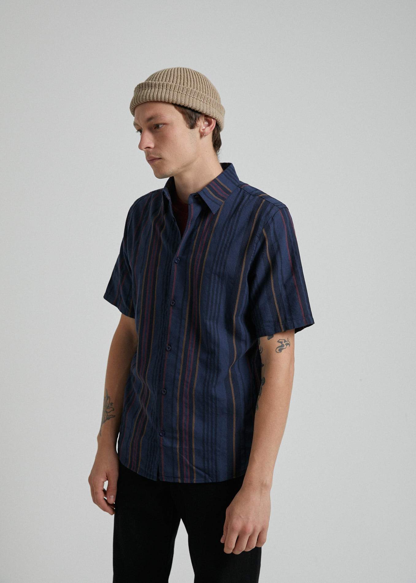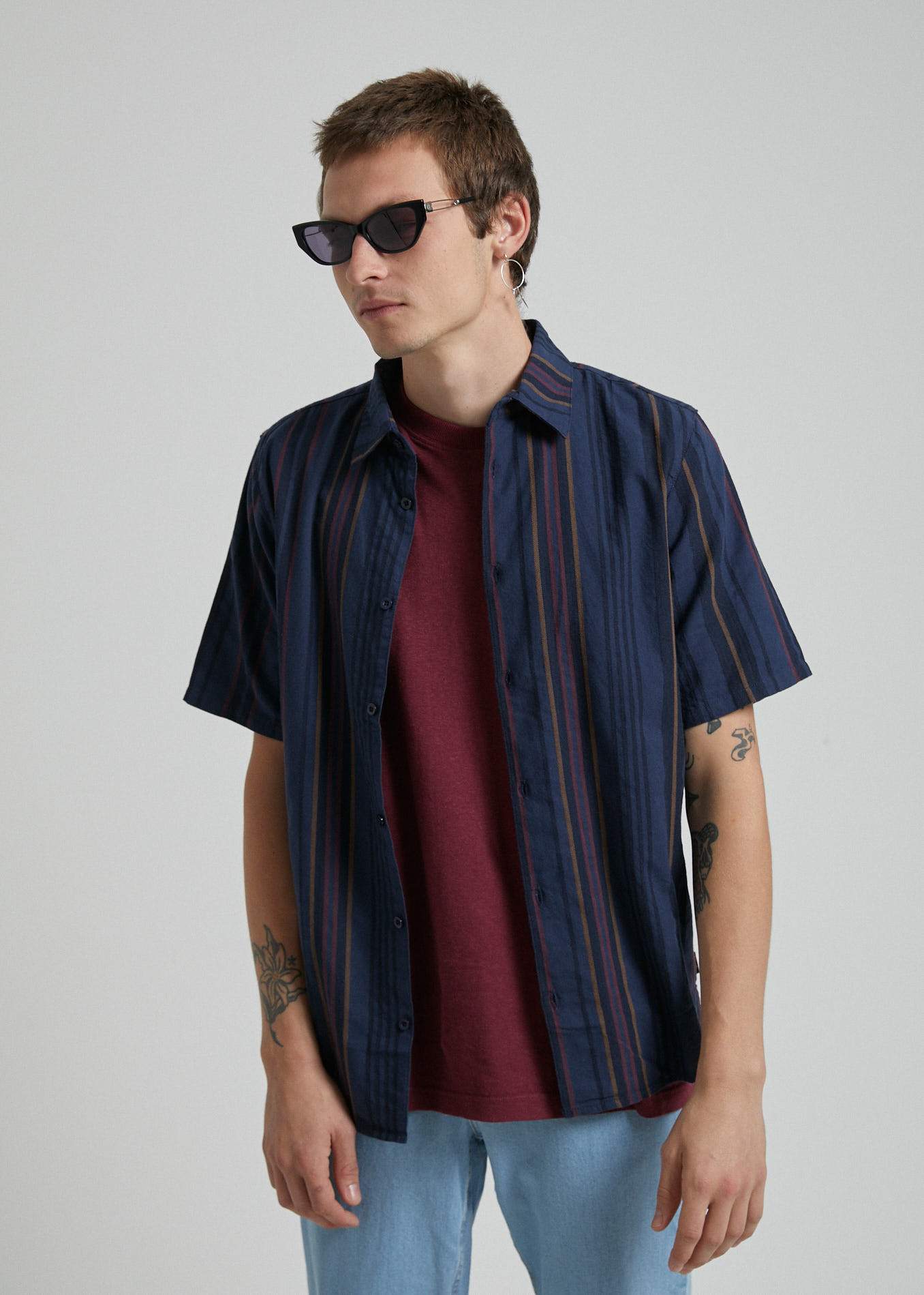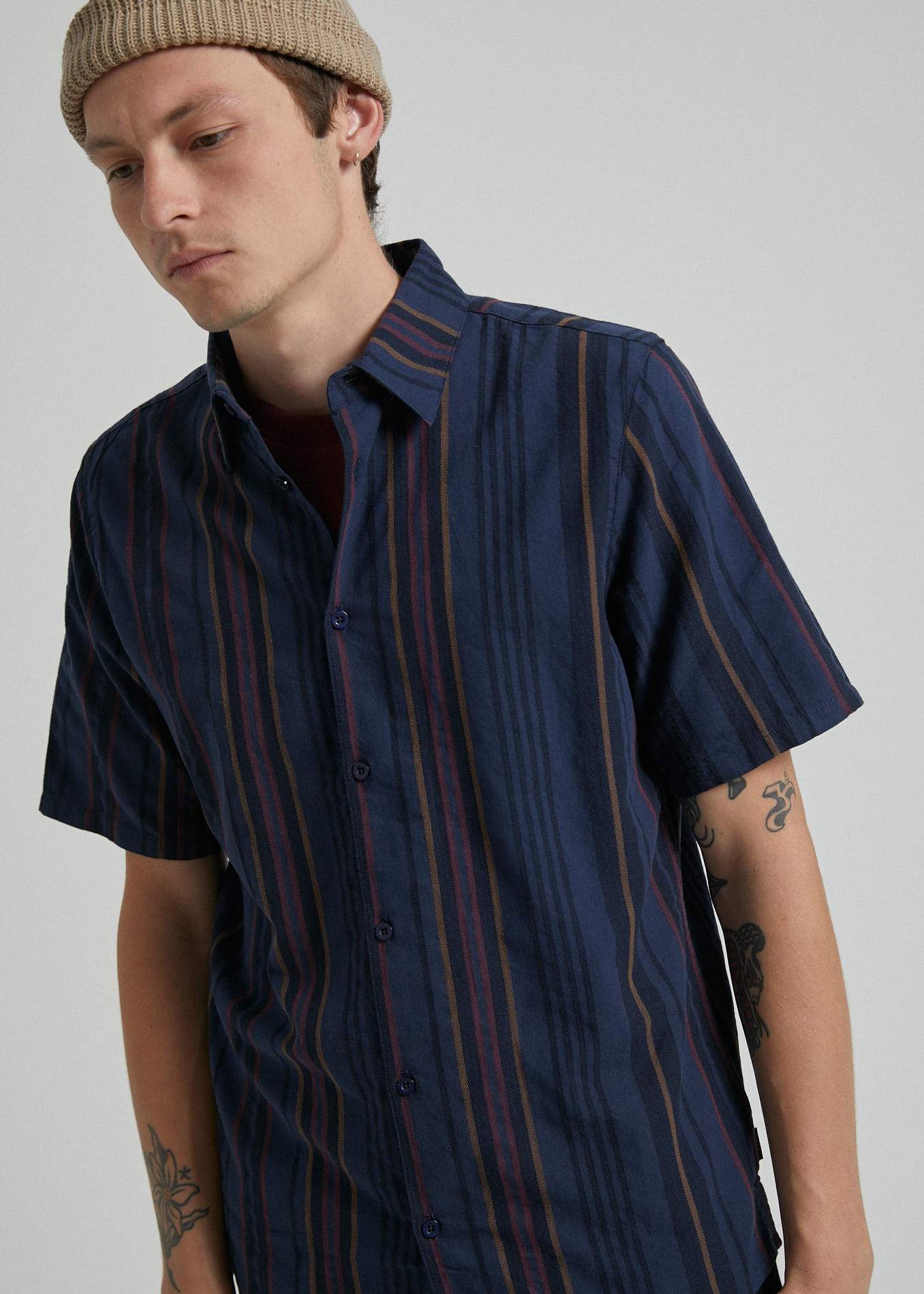 Designed in a button-up short sleeve collared shirt spun from cotton twill, the multi-coloured vertical jacquard stripe has a textural hand-feel that gives it a nice drape and body feel. Featuring a flat front and curved back hem, you can layer the Don Pedro over your favourite basic singlet or button it up all on its own.