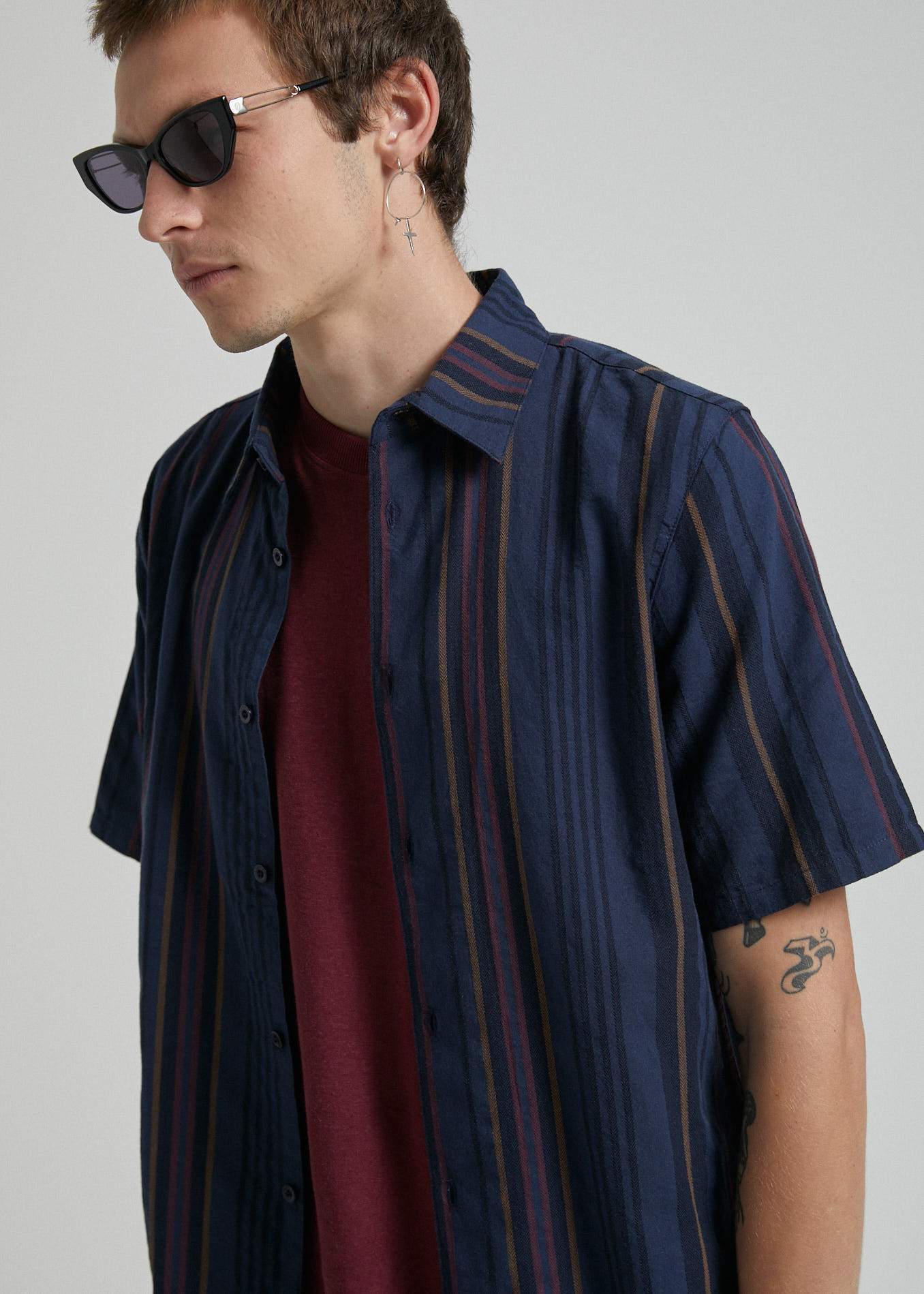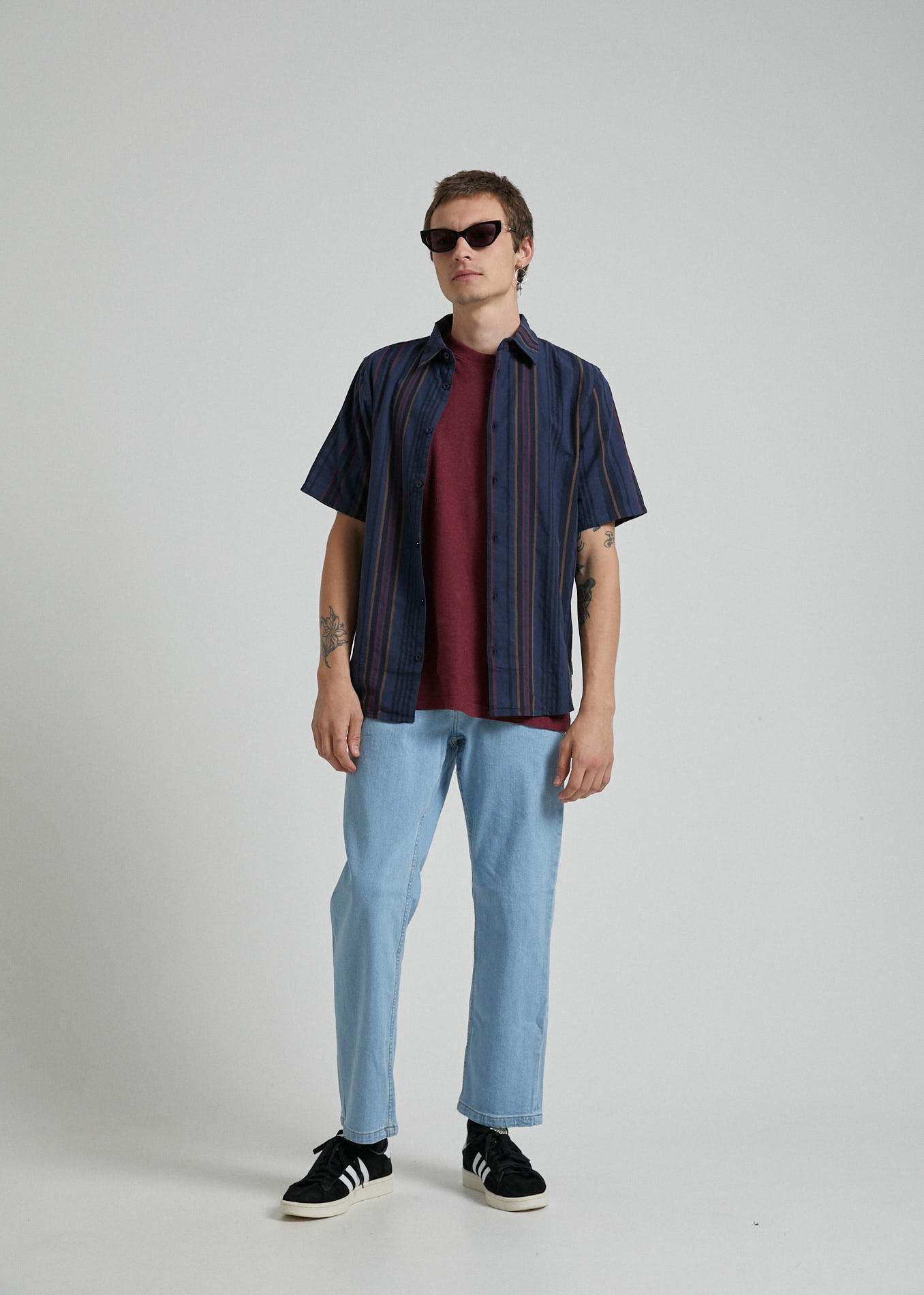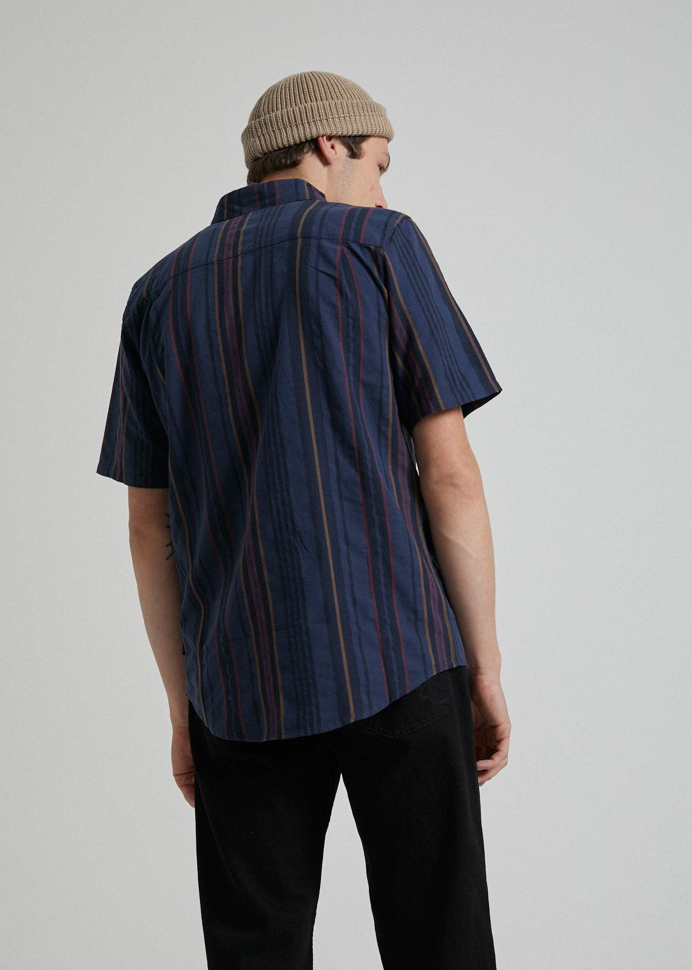 Designed in a button-up short sleeve collared shirt spun from cotton twill, the multi-coloured vertical jacquard stripe has a textural hand-feel that gives it a nice drape and body feel. Featuring a flat front and curved back hem, you can layer the Don Pedro over your favourite basic singlet or button it up all on its own.
