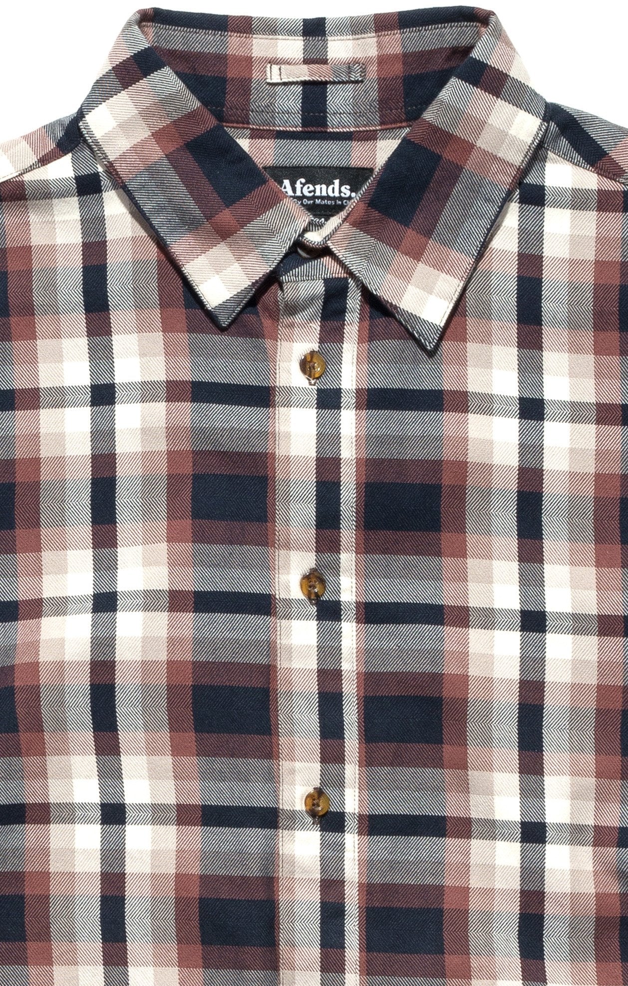 Our Fishas flanny is made in a cotton brushed woven flannel, yarn dyed in a dark rusty blue and red check print, and finished with retro tortoiseshell buttons.
