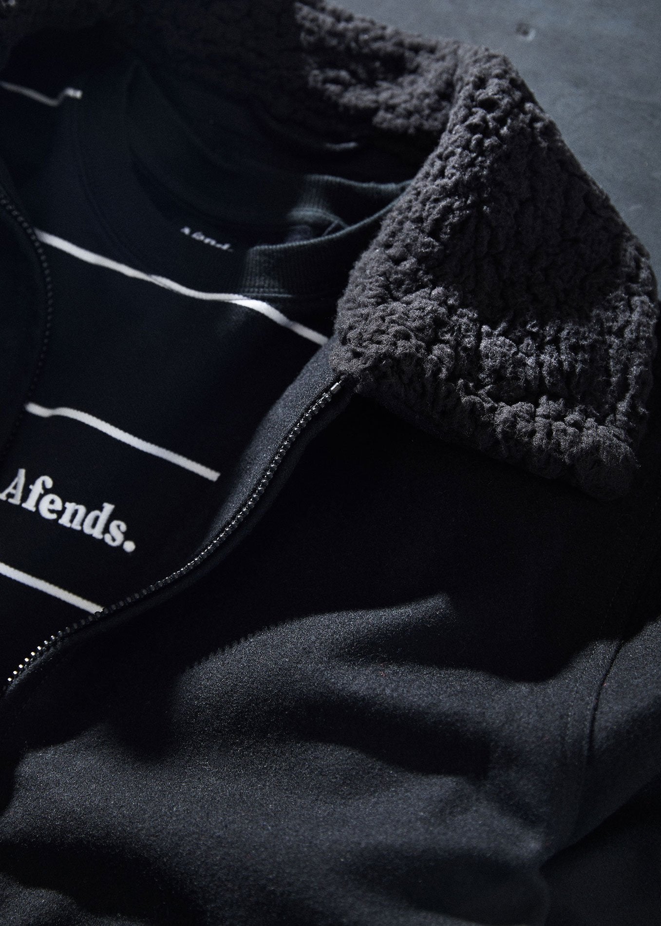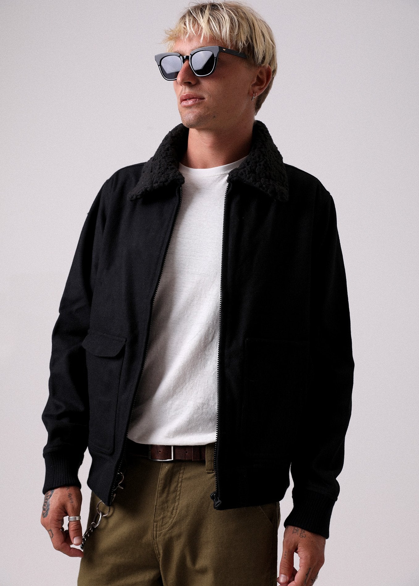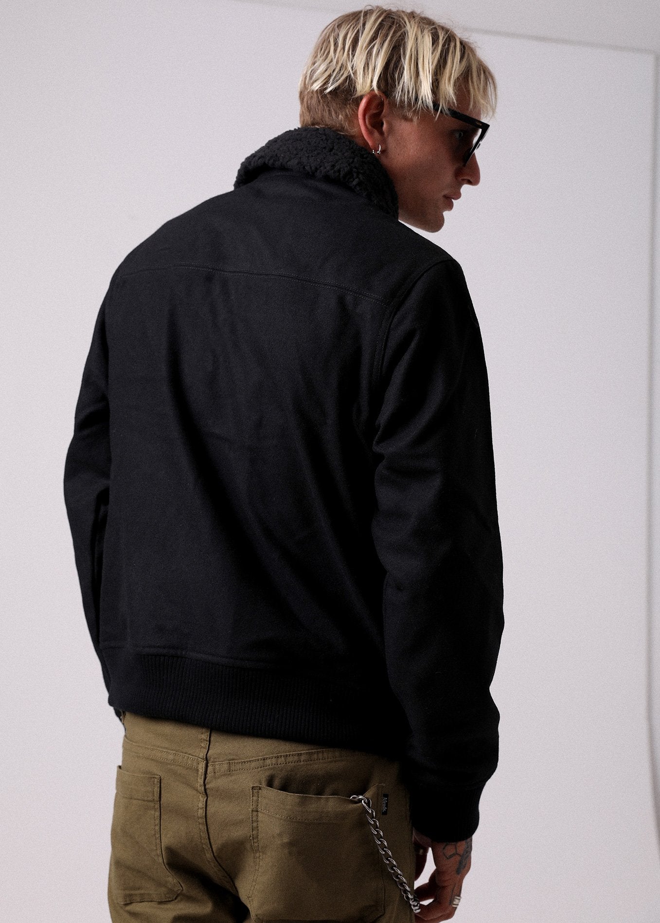 This is our Flying High Jacket. A warm wool blend jacket with full length front zip and contrast sherpa collar. This jacket will keep you super snug when you need it most.