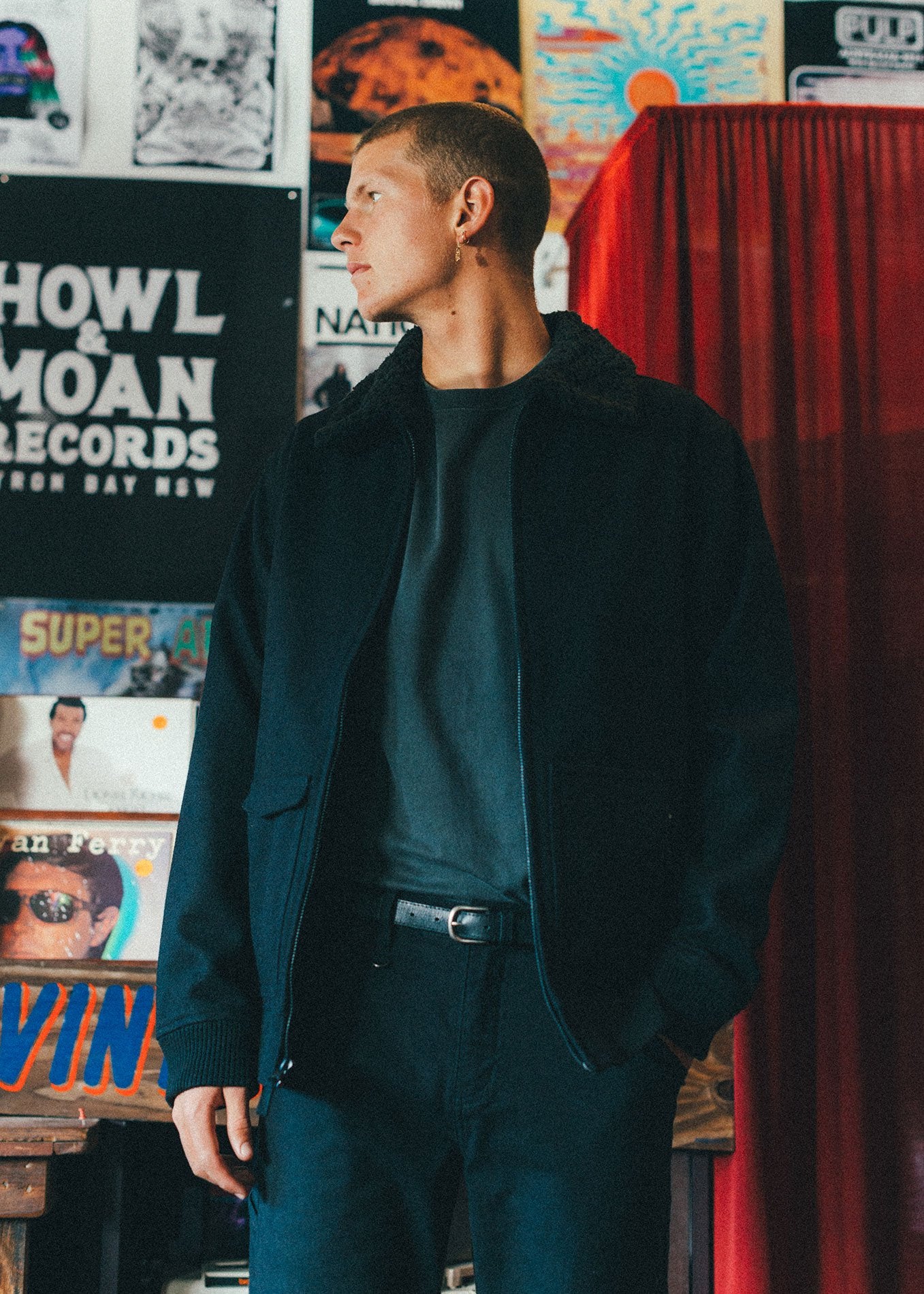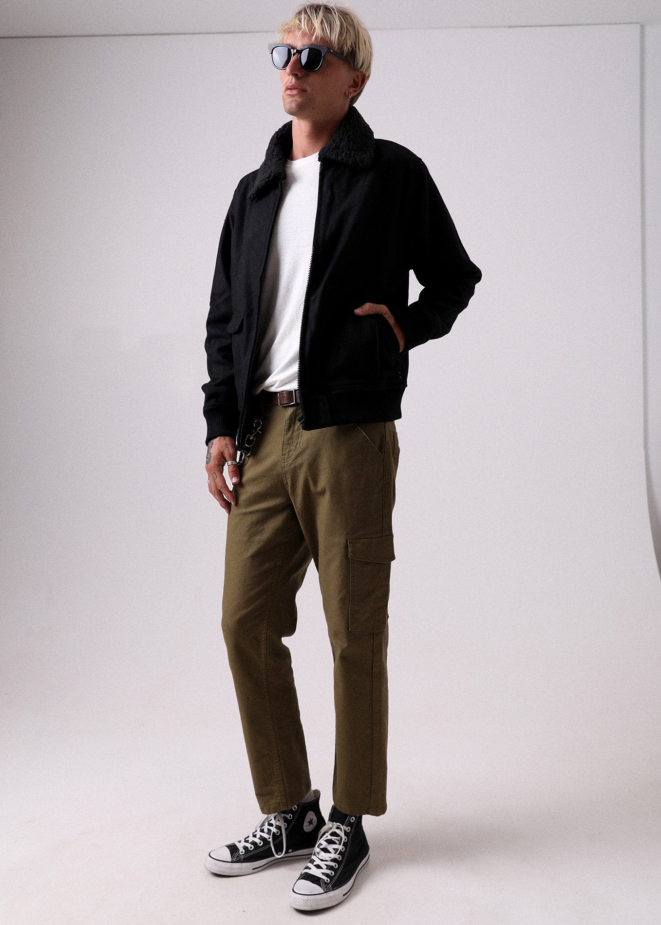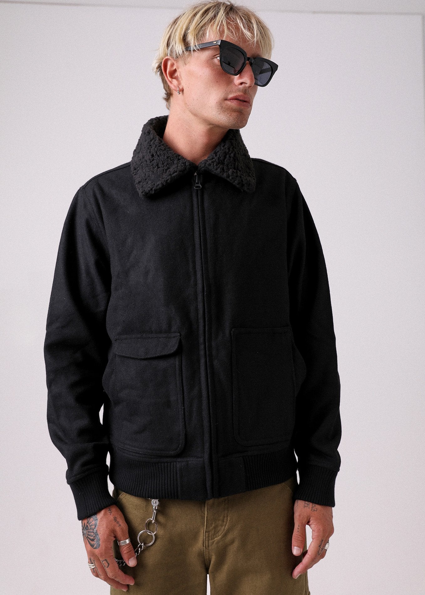 This is our Flying High Jacket. A warm wool blend jacket with full length front zip and contrast sherpa collar. This jacket will keep you super snug when you need it most.
