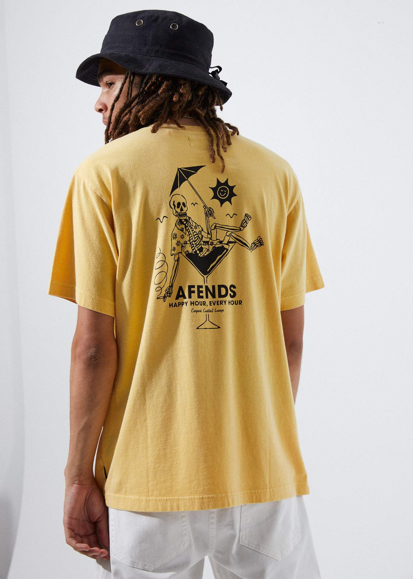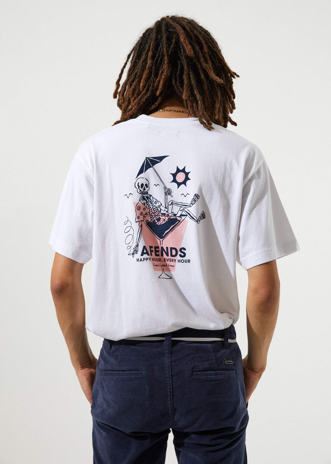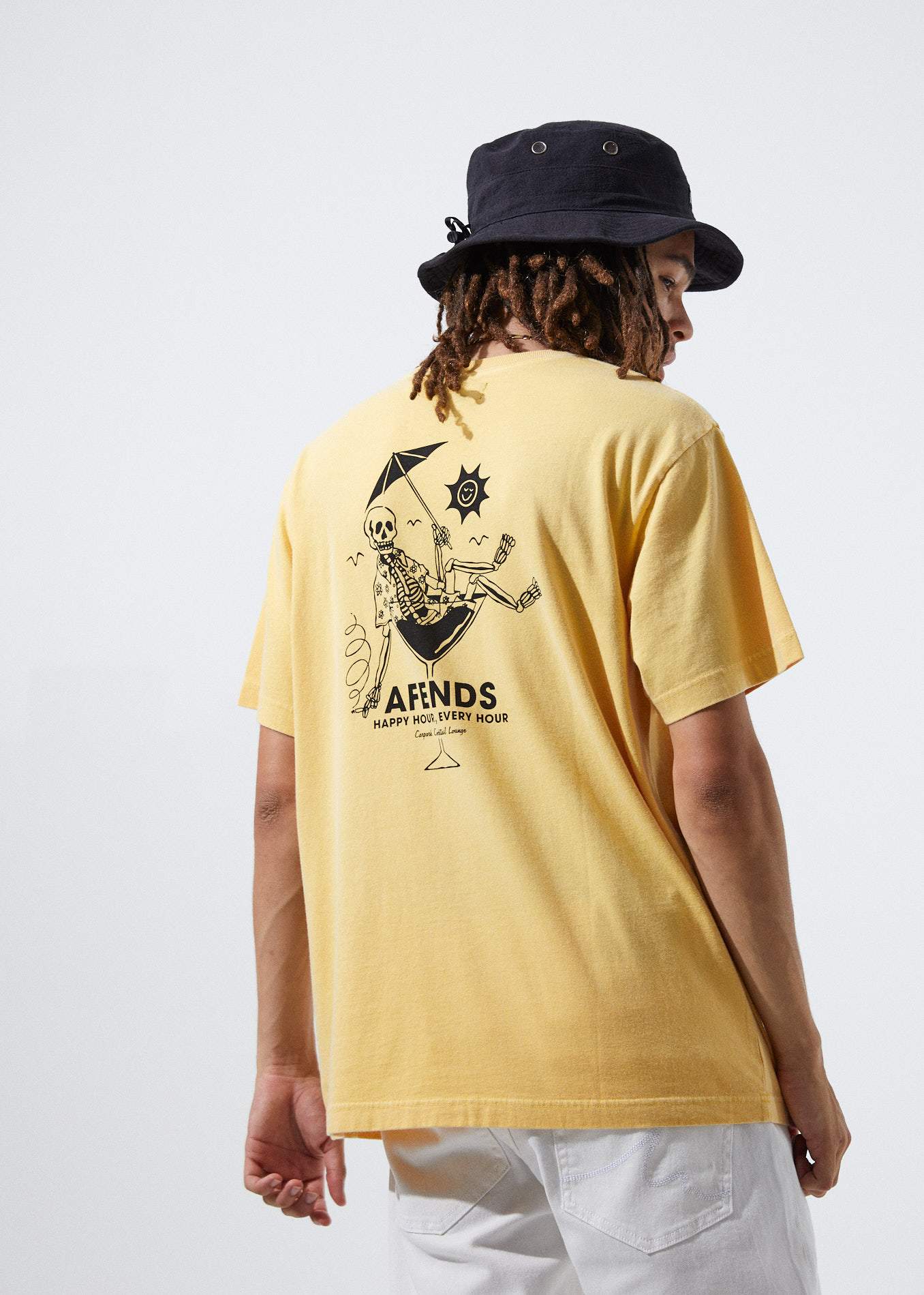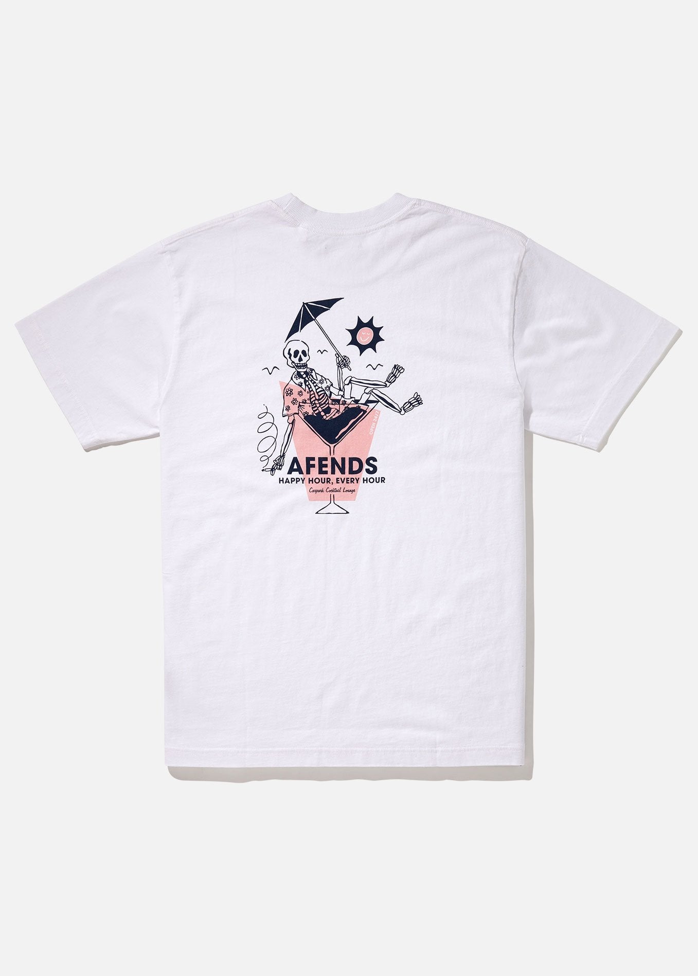 The Afends Happy Hour Retro Fit Tee is inspired by our favourite road tripping days, pulling up to cocktail lounges conveniently located at every beach carpark and serving up cold beers 24/7.