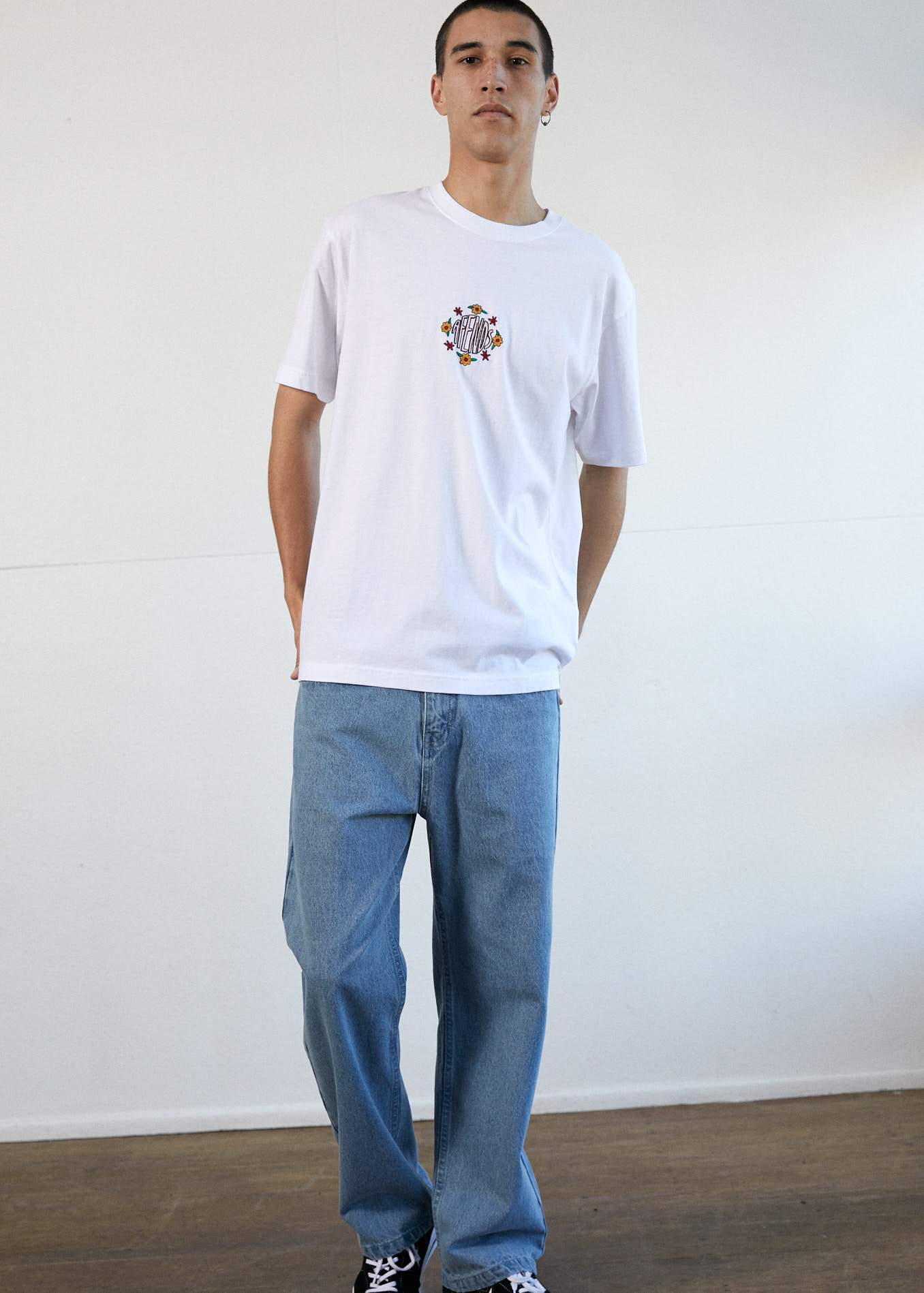 Featuring old school style circular floral embroidery, this will be a tee that gets more golden with age. Designed in our signature short sleeve retro fit with ribbed crew neck, our retro fit tees are a slightly heavier weight with a higher neckline and wider body for a true vintage tee look. Spun from super soft organic cotton, this one feels really good on.
