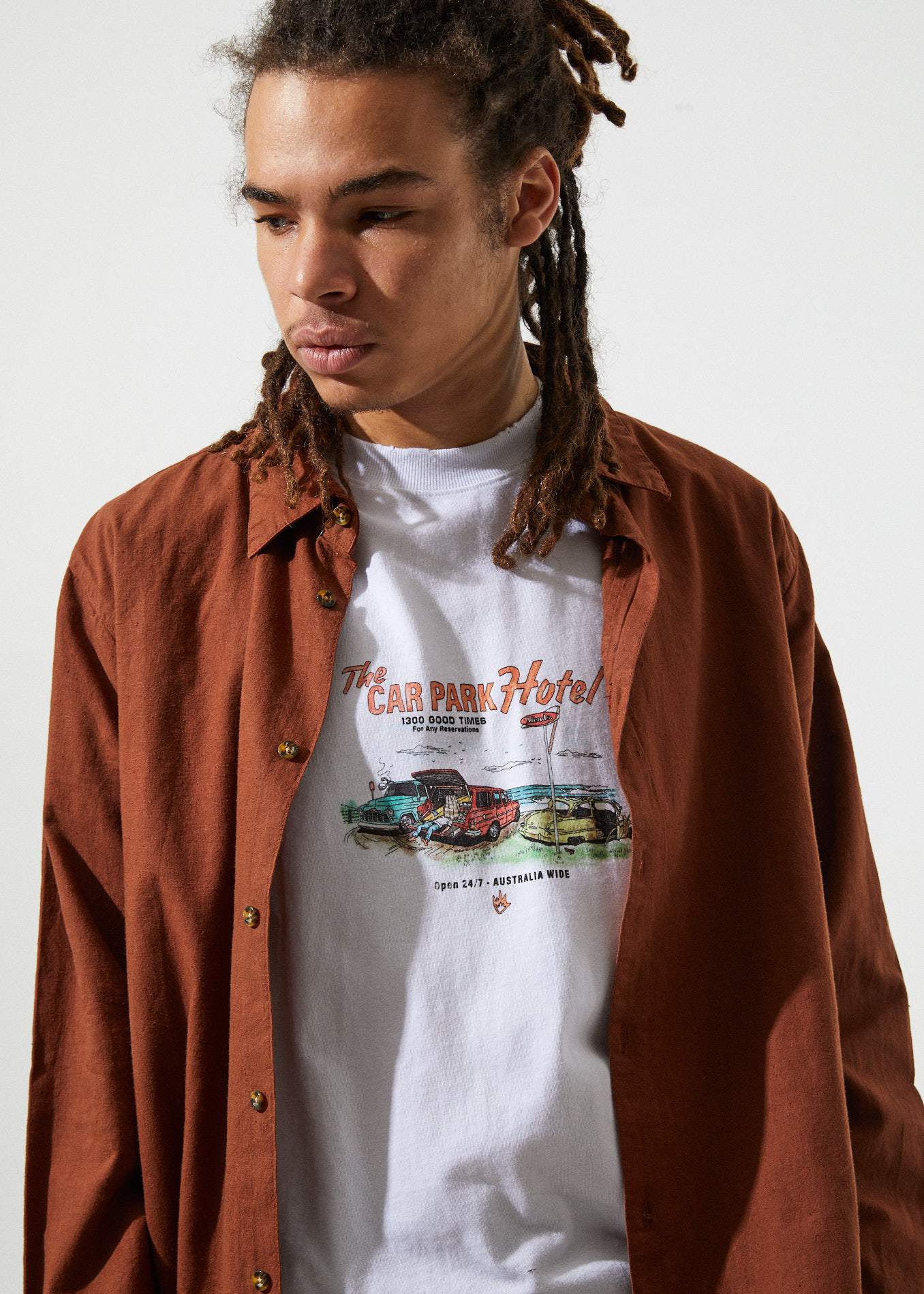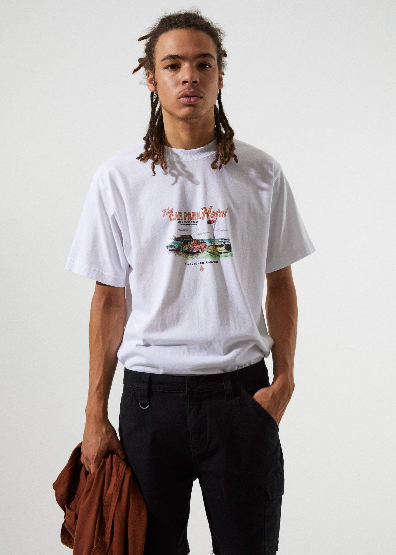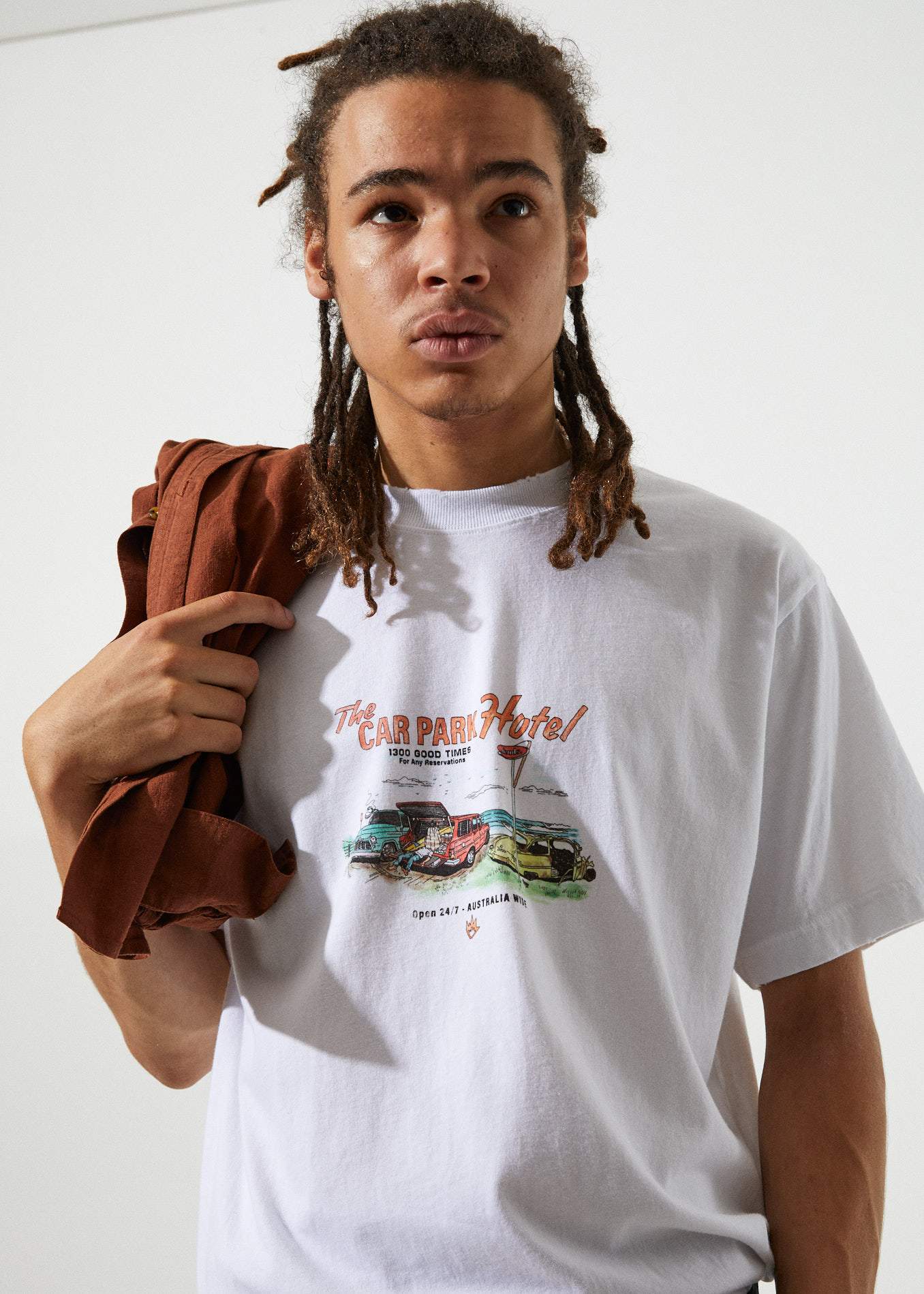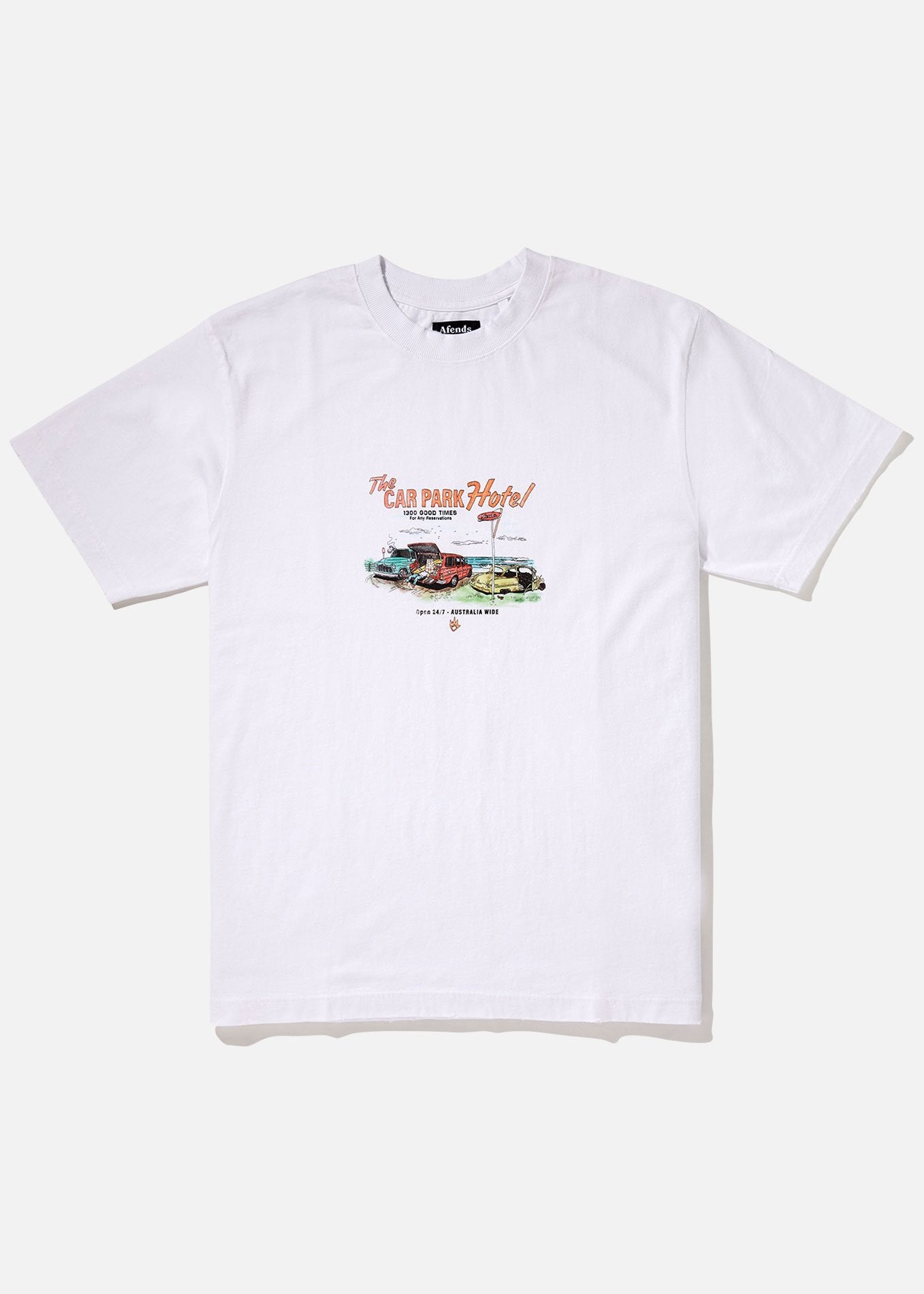 The Afends Hotel Merch Retro-Fit Tee captures the story of carpark hotels, inspired by our favourite van life road trip days. The custom artwork was created by our good mate Suds.