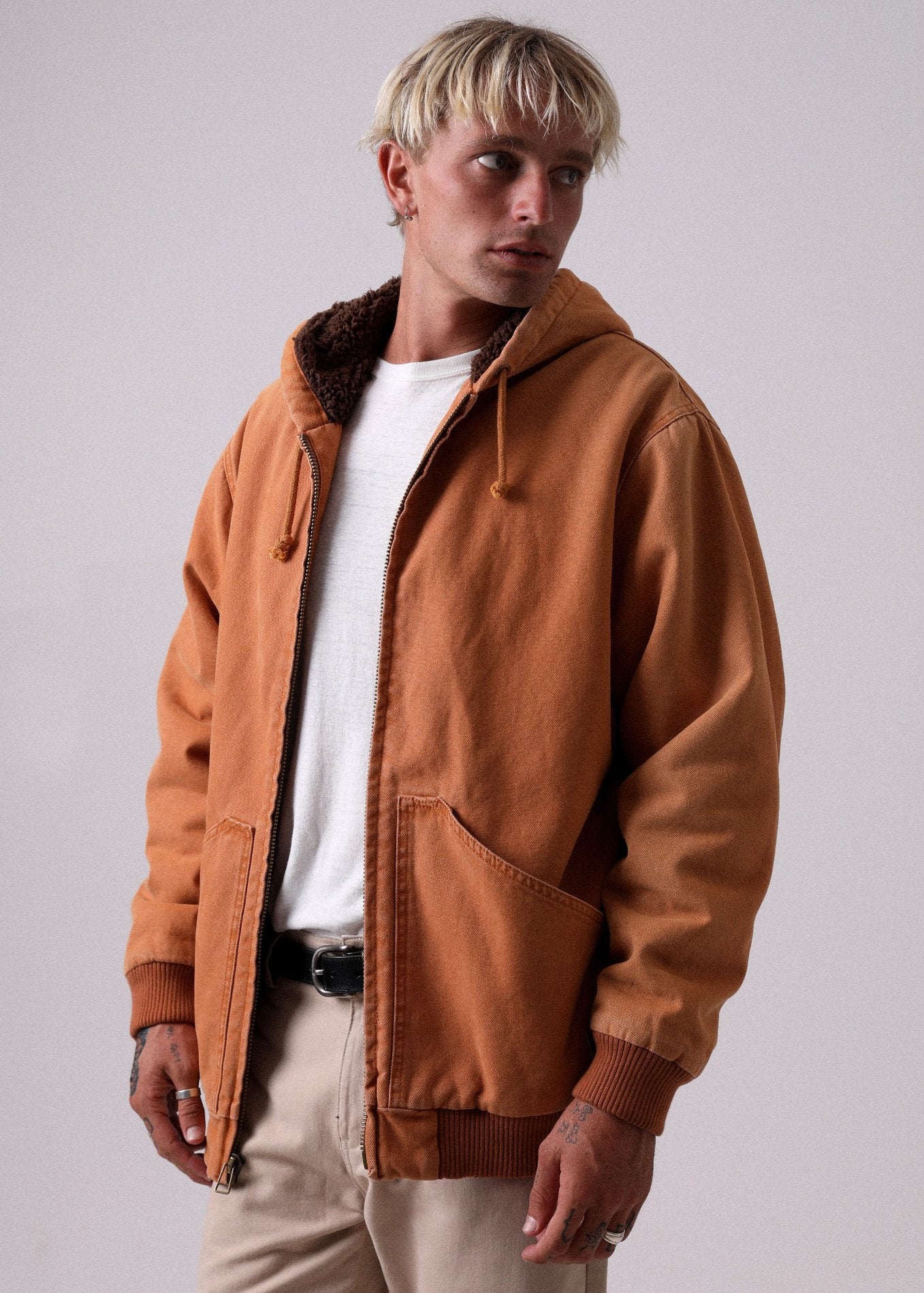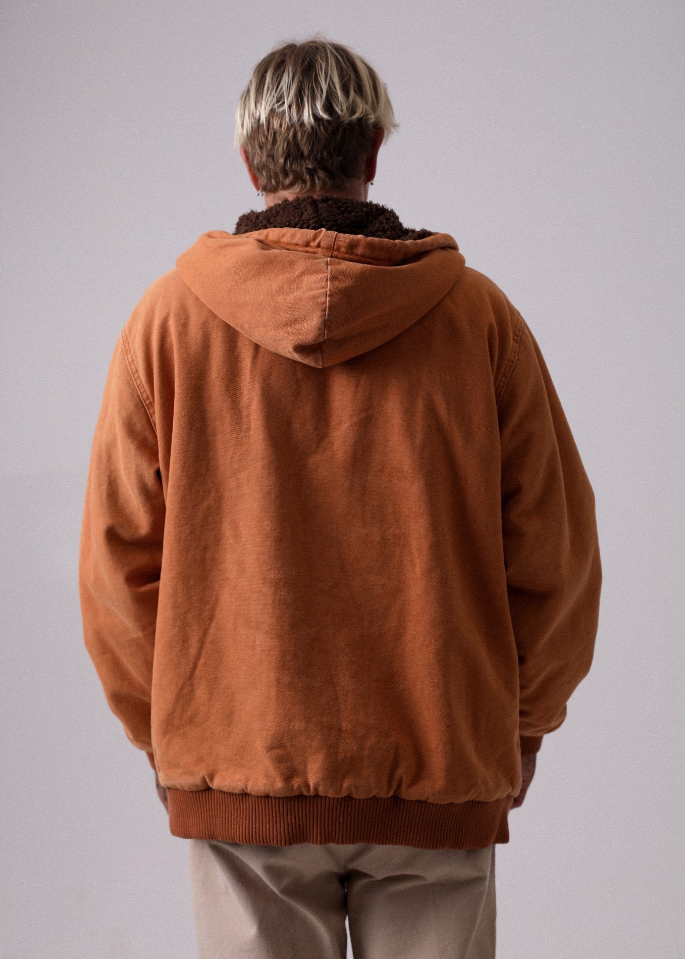 You'll live in your Mad World Jacket. Made in a durable cotton canvas & sherpa combo this jacket is made to last. Featuring double front pockets to stash all your goodies, fully lined inner & hood with soft sherpa and thick ribbed band along hem and wrist cuffs you won't wanna take this one off.