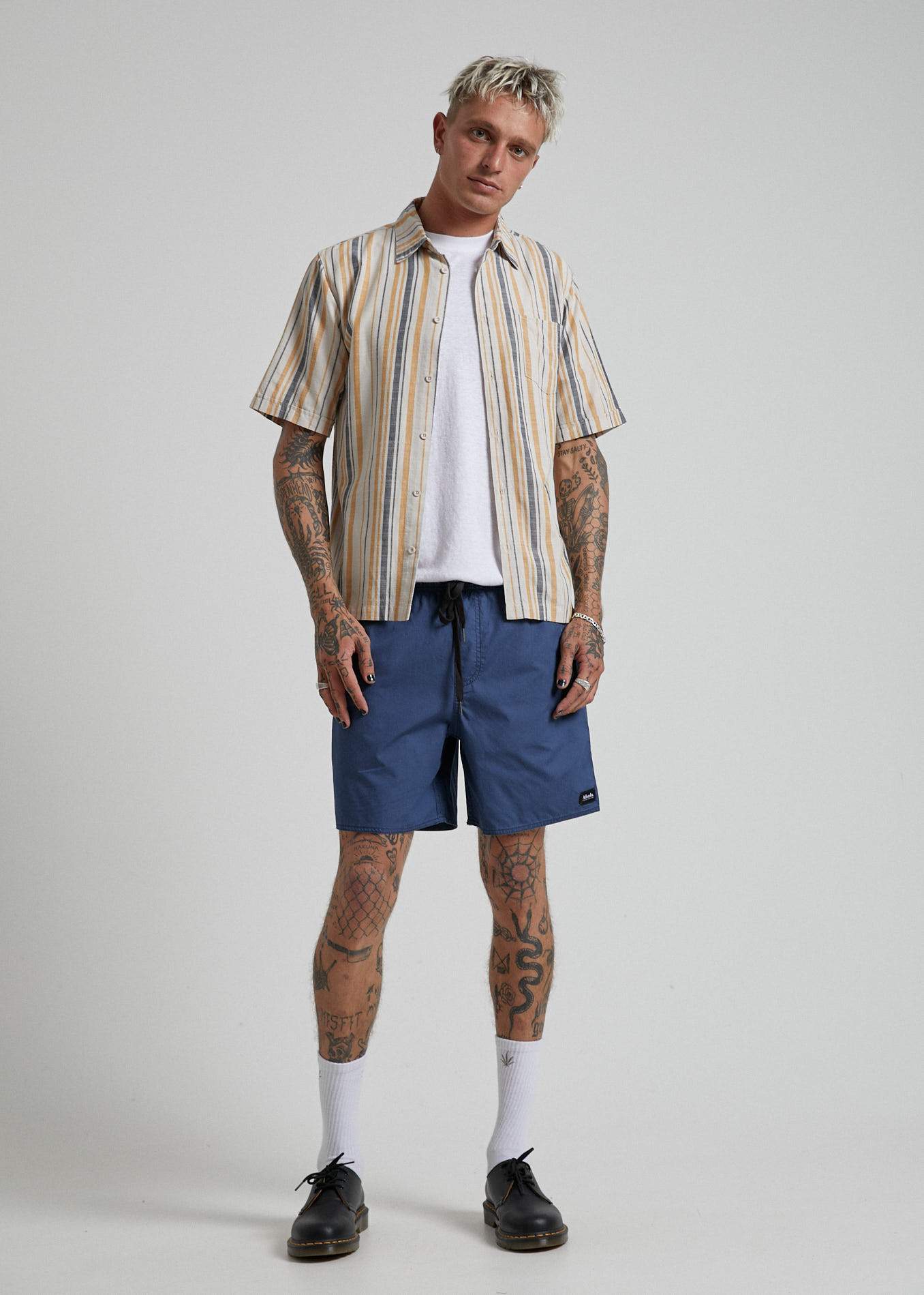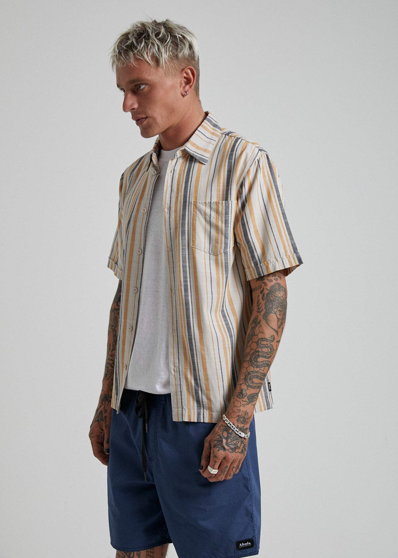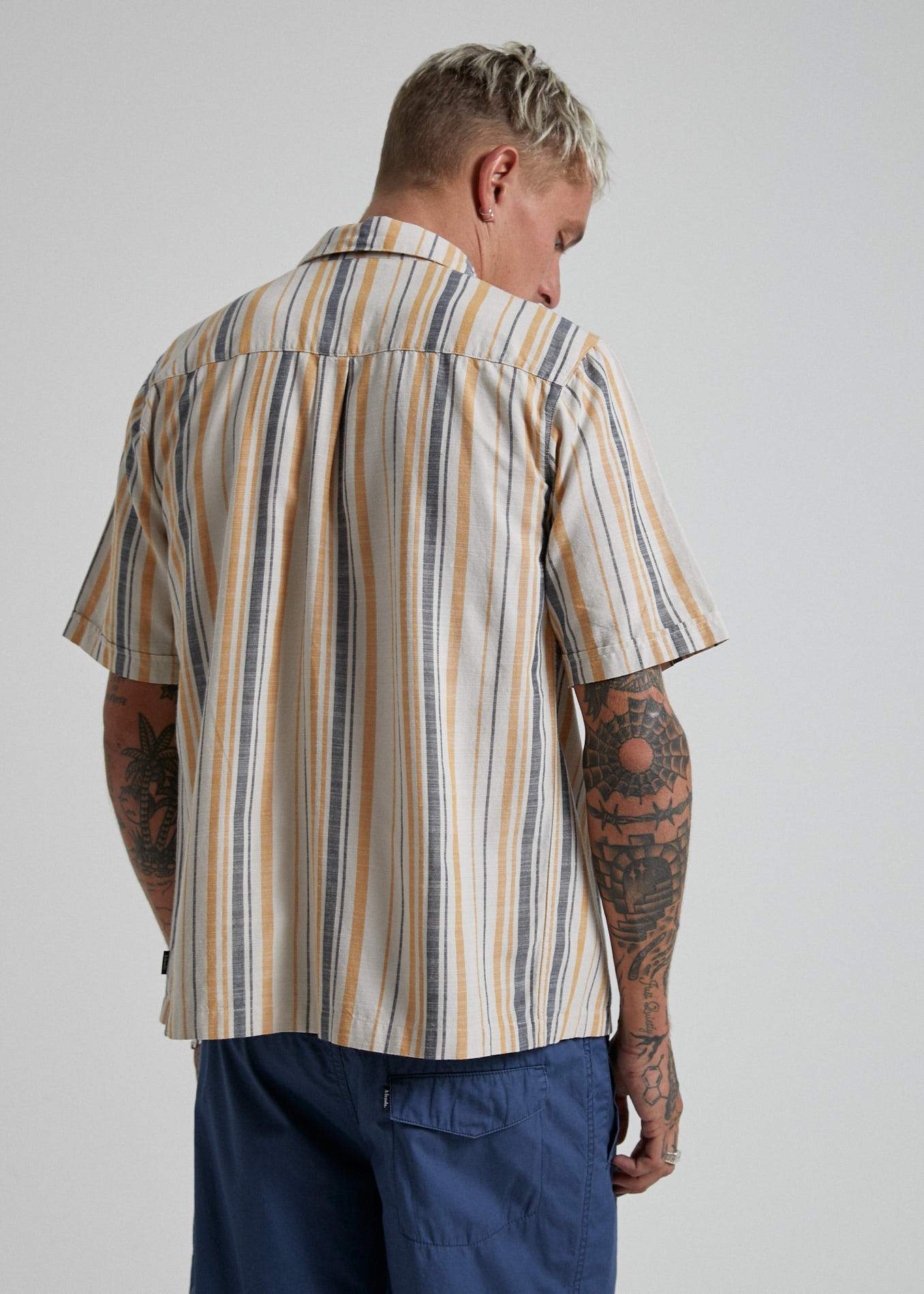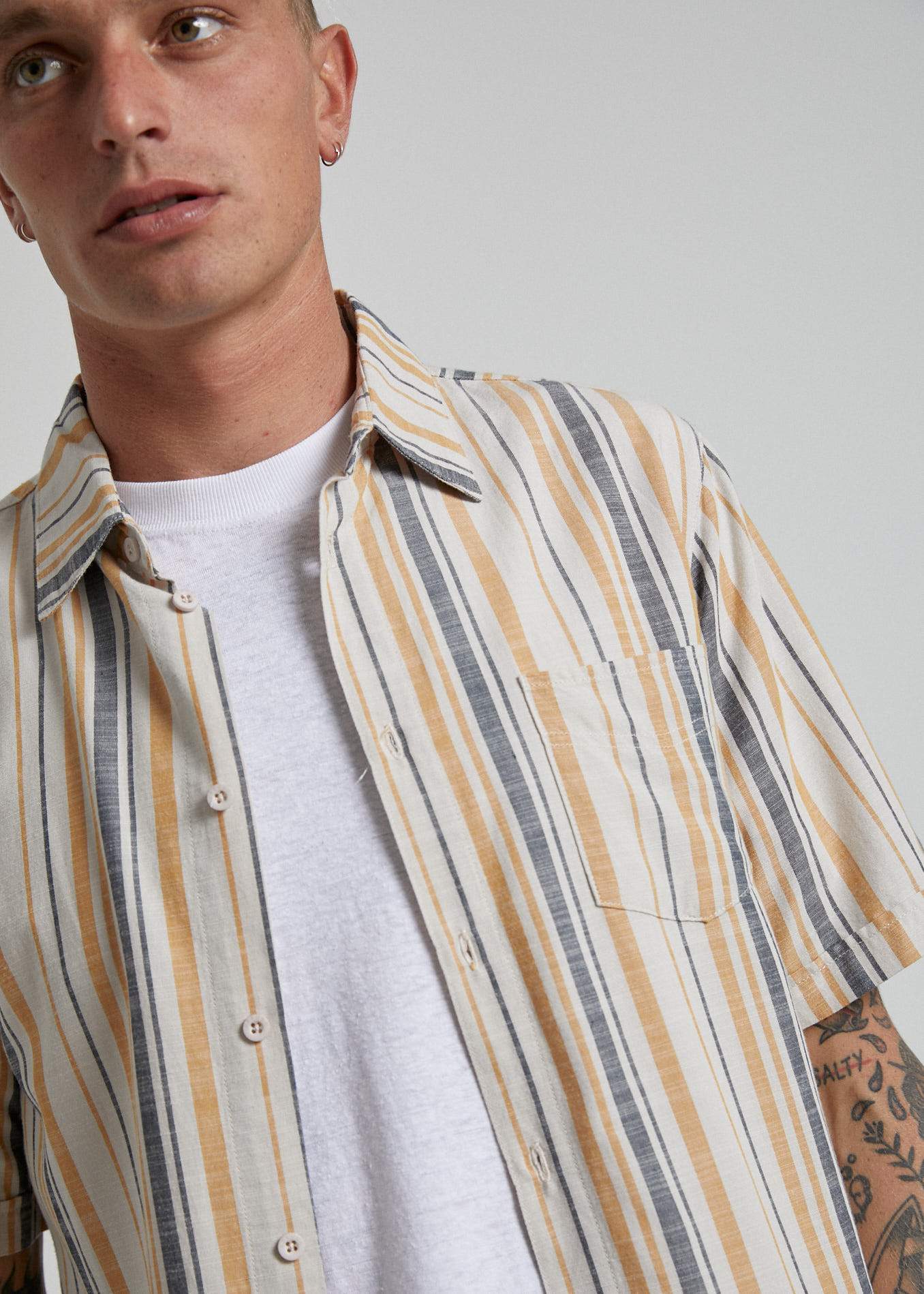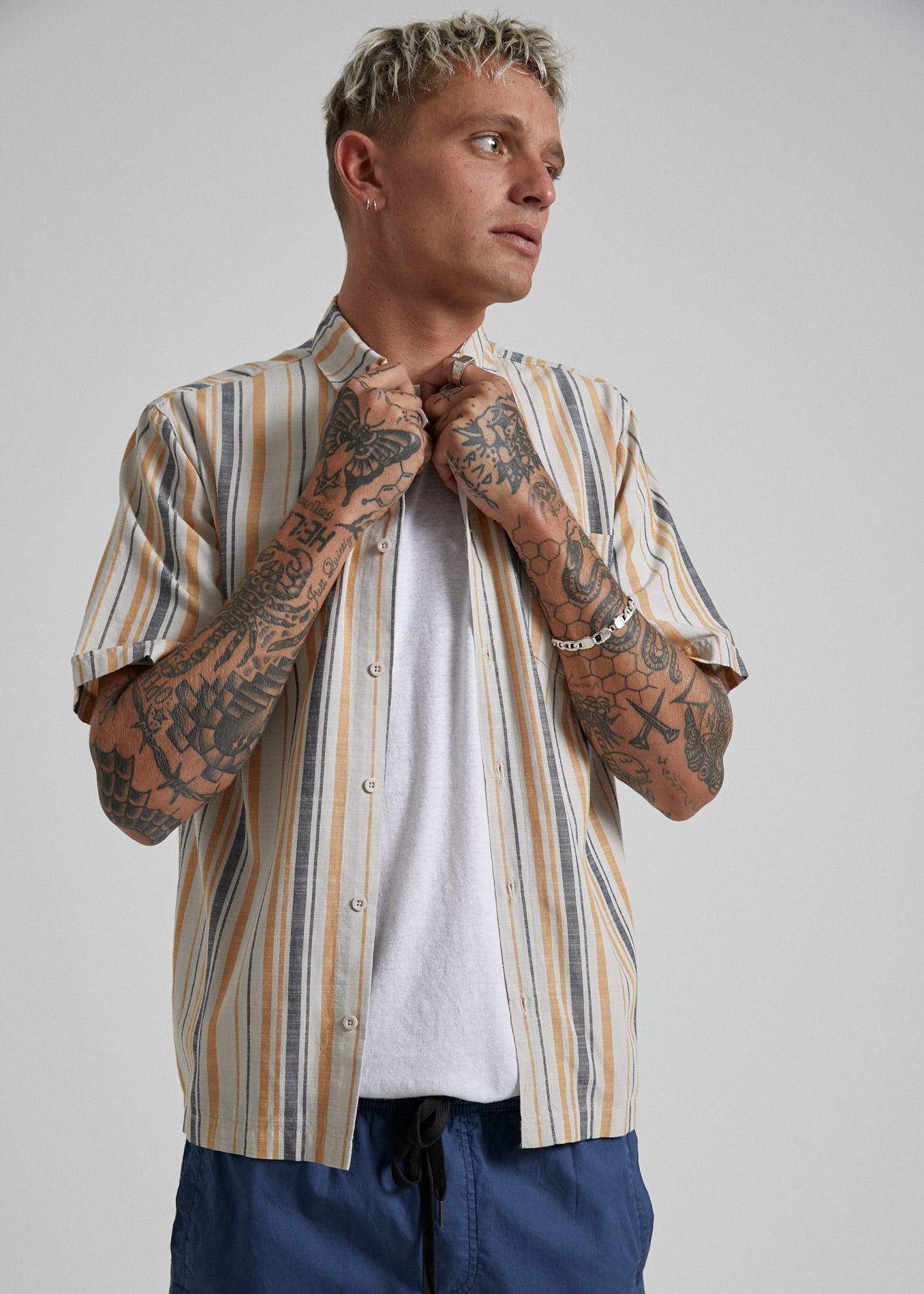 Slinging it 70s style in our Motel Short Sleeve Shirt. Spun from a lightweight and breathable cotton rayon blend, we have created a custom slub stripe textured fabric that took inspiration from the earthy tones that frequented the 70s.