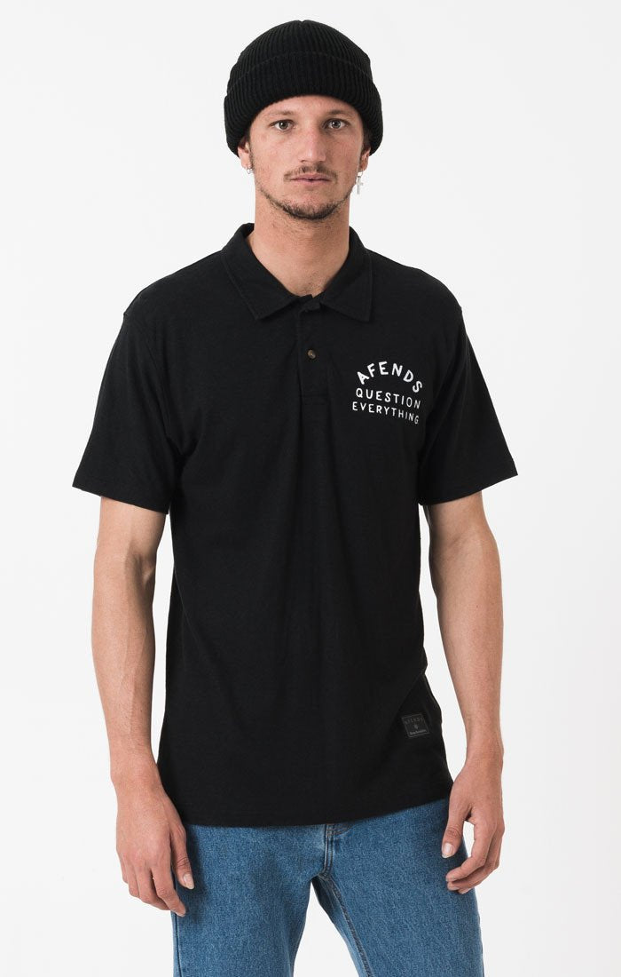 The Afends Hemp Polo Tee is a tailored cut with fitted sleeves and a collor, with three buttons and a pocket logo print