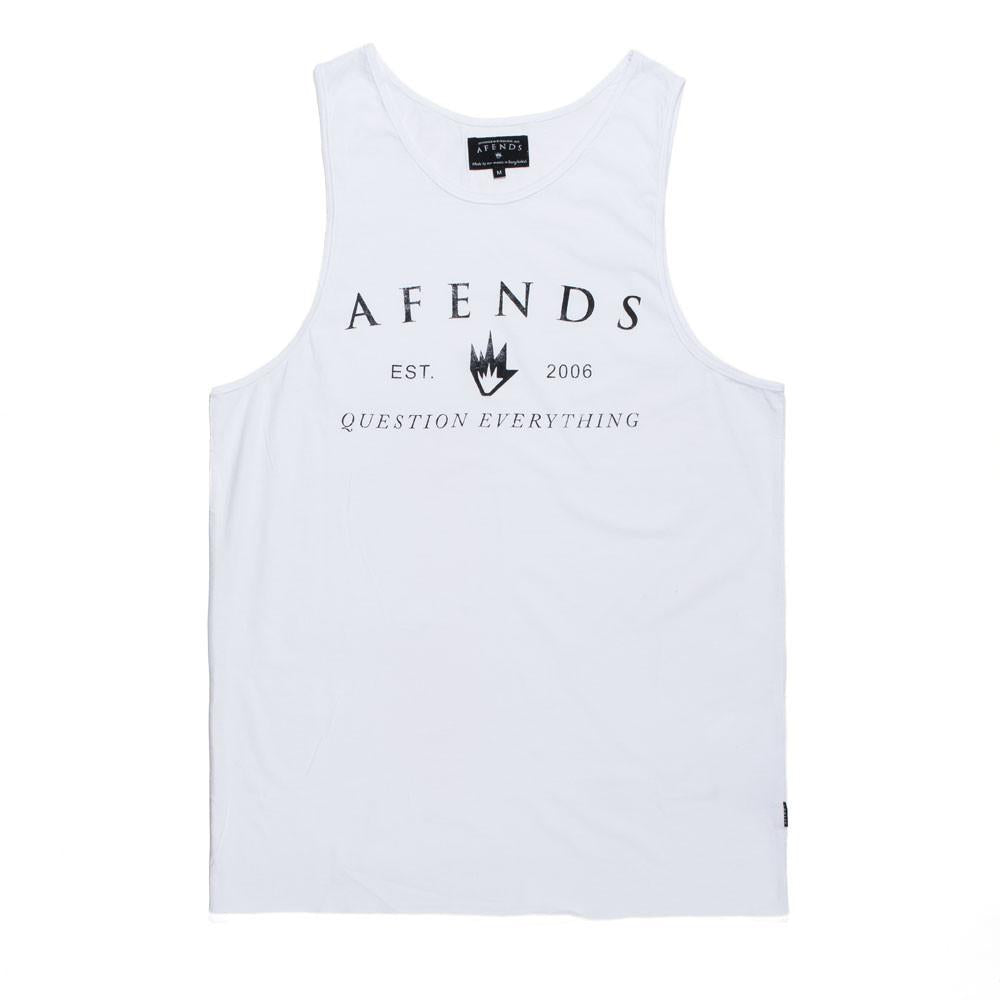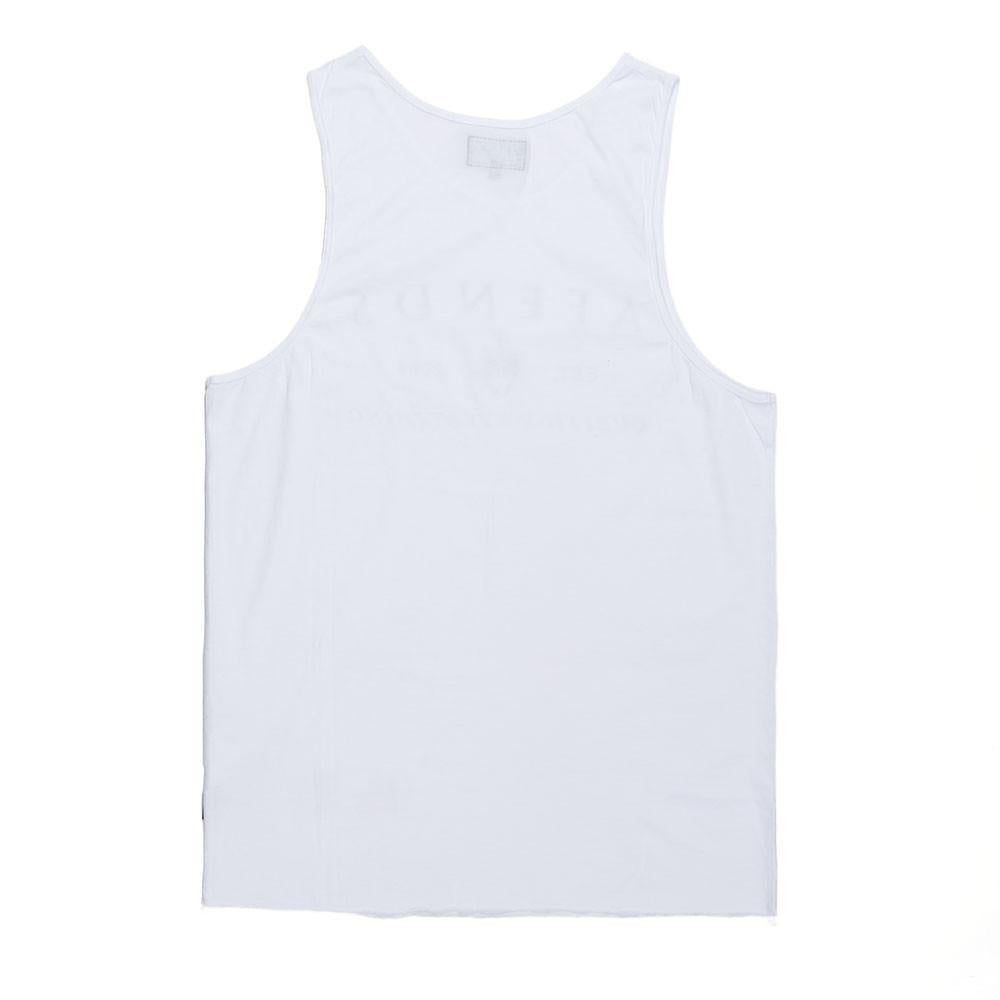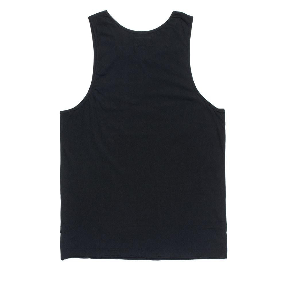 The Afends Tank is a slim, comfort fit singlet with open neck, wide shoulder straps, bottom raw edge (no hem), and small neck and armhole edging.