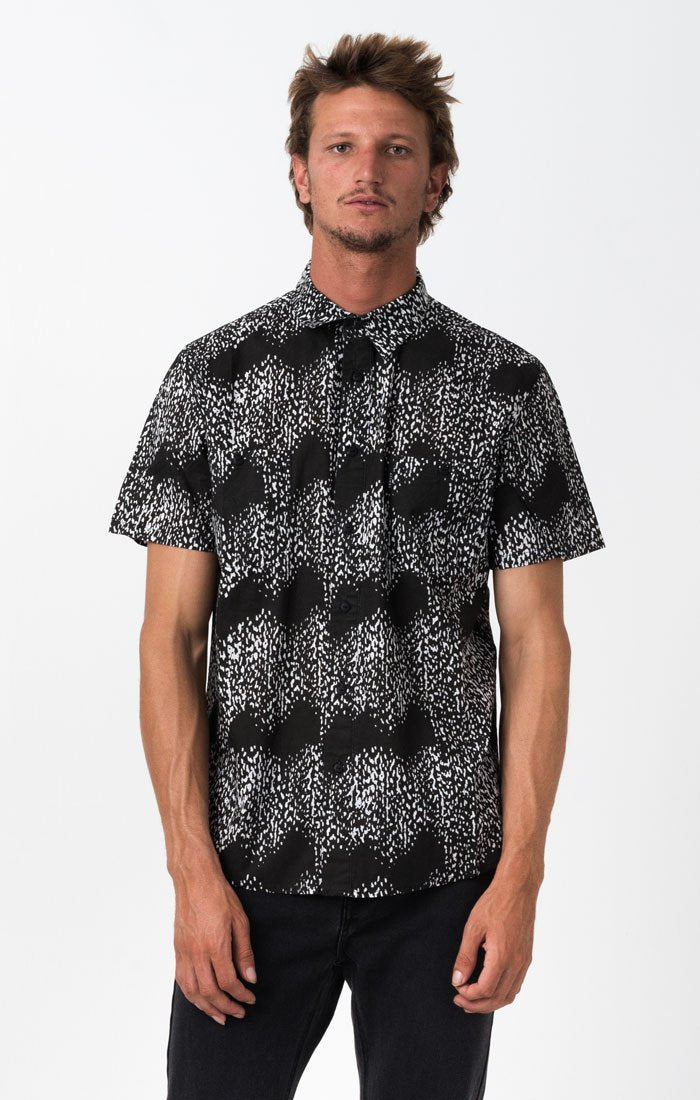 The Afends Short Sleeve Shirt comes with dozens of custom yardage prints, scalloped hem and high collar stand. Some have two chest pockets, others have one or none and they always come with unique buttons.