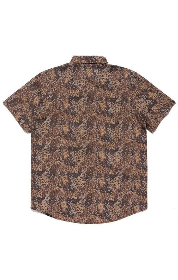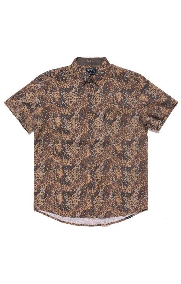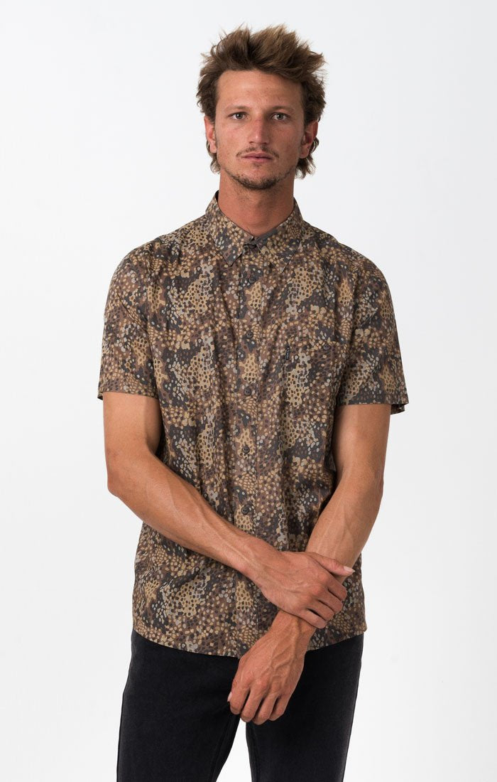 The Afends Short Sleeve Shirt comes with dozens of custom yardage prints, scalloped hem and high collar stand. Some have two chest pockets, others have one or none and they always come with unique buttons.